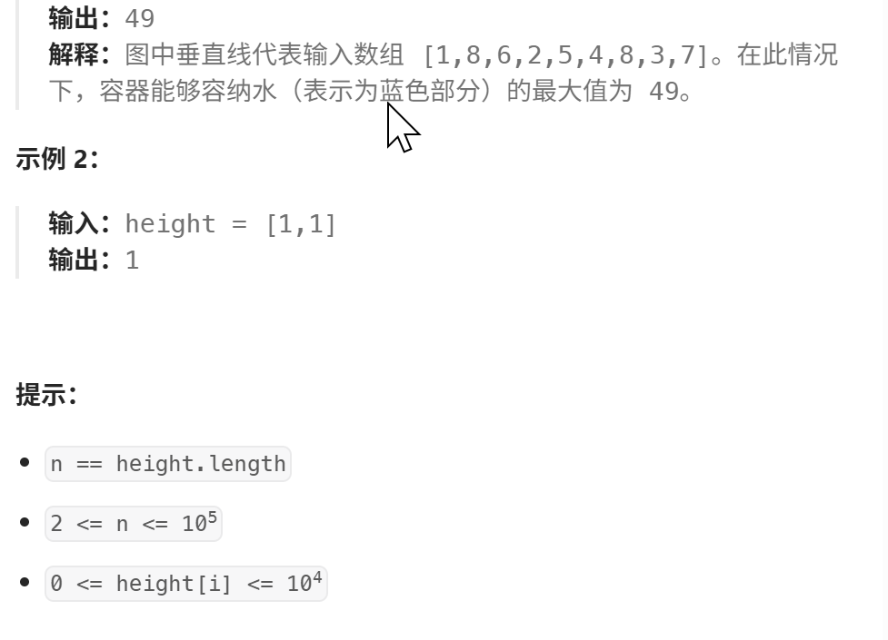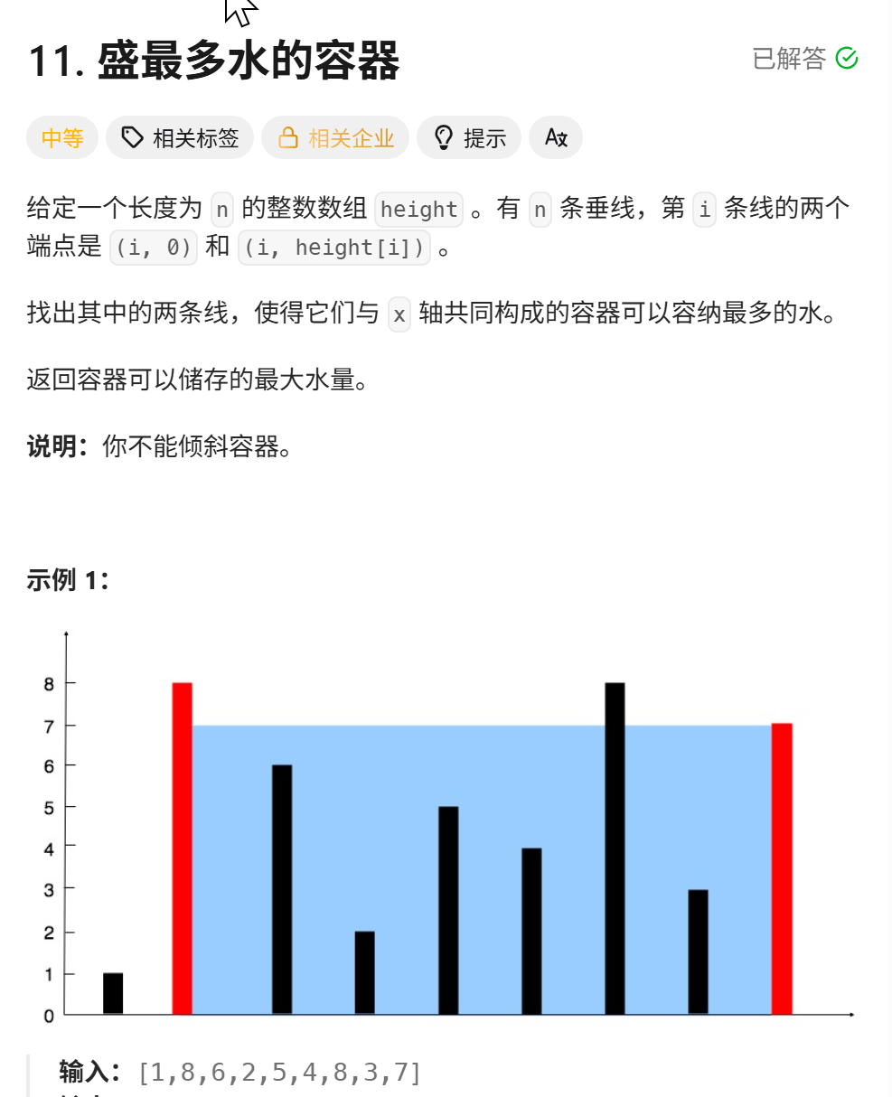 class Solution {public int maxArea(int[] height) {int i=0, j=height.length-1;int max = 0;while(i<j) {max=Math.max(Math.min(height[i],height[j])*(j-i),max);//移动较小的墙的点//这样相当于增加了最大水量,因为以两边最小的墙高为高if(height[i]<height[j]) {i++;}else {j--;}}return max;}