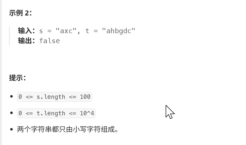 class Solution {public boolean isSubsequence(String s, String t) {if(s.length()>t.length()) {return false;}else if(s.length()==t.length() && s.length()!=0 && s.equals(t) ){return false;}else {int i=0, j=0;while(j<t.length() && i<s.length()) {//说明两个字符匹配if(s.charAt(i)==t.charAt(j)) {i++;j++;}//不匹配else {//说明父子串已经走完了,但是子串还没有走完if(j==t.length()-1) {return false;}j++;}} // 如果子串没有到达最后一个字符+1的位置,说明子序列没走完,匹配不上if(i!=s.length()) {return false;}return true;}}