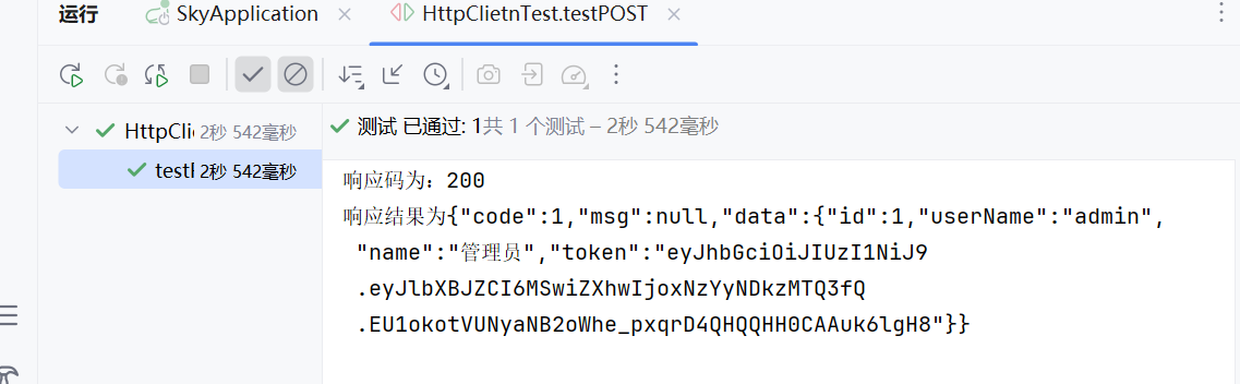 public void testPOST() throws Exception {//创建HttpClient对象CloseableHttpClient httpClient= HttpClients.createDefault();//创建请求对象HttpPost httpPost = new HttpPost("http://localhost:8080/admin/employee/login");//因为post请求需要提交请求参数,还是json形式,所以需要封装参数JSONObject jsonObject =new JSONObject();jsonObject.put("username","admin");jsonObject.put("password", "123456");StringEntity entity = new StringEntity(jsonObject.toString());//指定编码方式entity.setContentEncoding("utf-8");//指定数据格式entity.setContentType("application/json");httpPost.setEntity(entity);//发送POST请求CloseableHttpResponse response = httpClient.execute(httpPost);//解析返回结果int statusCode = response.getStatusLine().getStatusCode();System.out.println("响应码为:"+statusCode);HttpEntity entity1 = response.getEntity();String body = EntityUtils.toString(entity1);System.out.println("响应结果为"+body);//关闭资源response.close();httpClient.close();