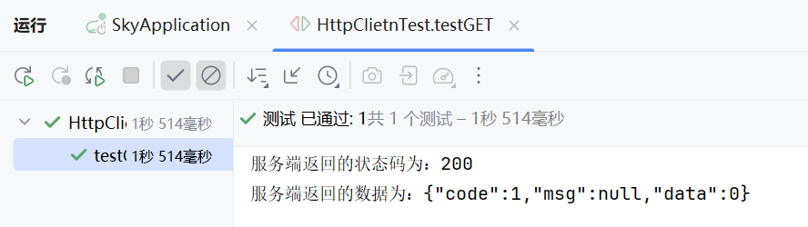 public void testGET() throws IOException {//创建HttpClient对象:HttpClients.createDefault().varCloseableHttpClient httpClient= HttpClients.createDefault();////创建请求对象:ew HttpGet().var,()写请求的地址HttpGet httpGet = new HttpGet("http://localhost:8080/user/shou/status");//发送请求:httpClient.execute(httpGet).varCloseableHttpResponse response = httpClient.execute(httpGet);//获取服务端返回的状态码判断请求成没成功int statusCode =response.getStatusLine().getStatusCode();System.out.println("服务端返回的状态码为:"+statusCode);//获得响应回来的数据:response.getEntity().varHttpEntity entity = response.getEntity();//因为数据封装成了HttpEntity,需要使用工具类进行解析:String body = EntityUtils.toString(entity);System.out.println("服务端返回的数据为:"+body);//关闭资源response.close();httpClient.close();