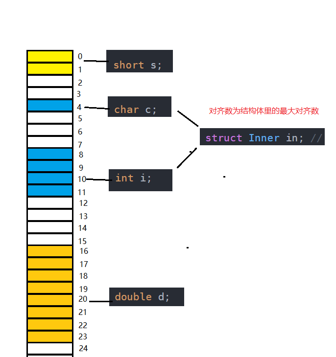 {short s; // 2字节struct Inner in; // 对齐数=Inner的最大对齐数4double d; // 8字节