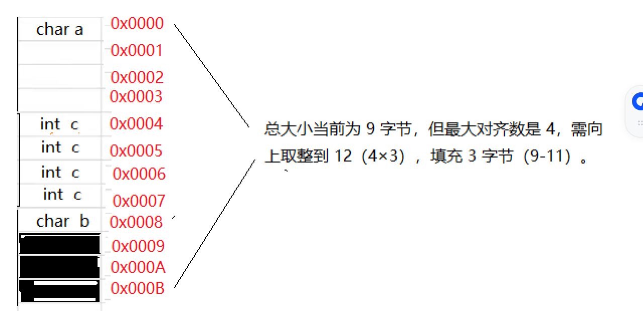 计算逻辑:若前一个成员结束后,当前成员的起始地址不是自身对齐数的倍数,则编译器会插入 “填充字节”(padding),直到满足条件。