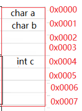 c:前一个结束于 1,需对齐到 4 的倍数(偏移 4),填充 2 字节(2-3),c占 4-7(4 字节);