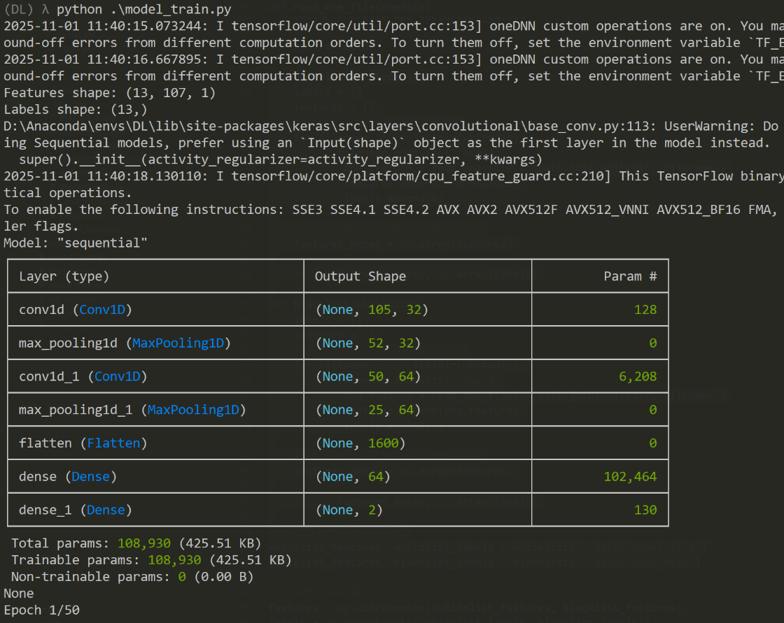 model = tf.keras.Sequential([tf.keras.layers.Conv1D(32, kernel_size=3, activation='relu', input_shape=(vec_data.features.shape[1], 1)),tf.keras.layers.MaxPooling1D(pool_size=2),tf.keras.layers.Conv1D(64, kernel_size=3, activation='relu'),tf.keras.layers.MaxPooling1D(pool_size=2),tf.keras.layers.Flatten(),tf.keras.layers.Dense(64, activation='relu'),tf.keras.layers.Dense(2, activation='softmax') # 二分类