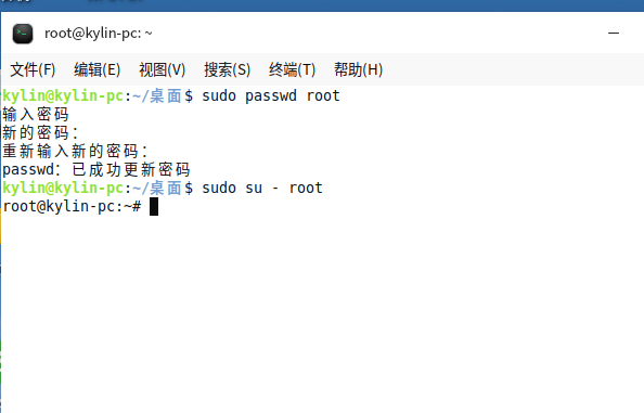 方式2:用su命令:若已提前设置 root 密码,可在终端输入su -或su root,之后输入设置好的 root 密码,验证成功后即可切换。若未设置 root 密码,需先输入sudo passwd root,按提示输入当前普通用户密码,再设置并确认 root 密码,完成后就能用该方式切换了,具体操作如下图所示: