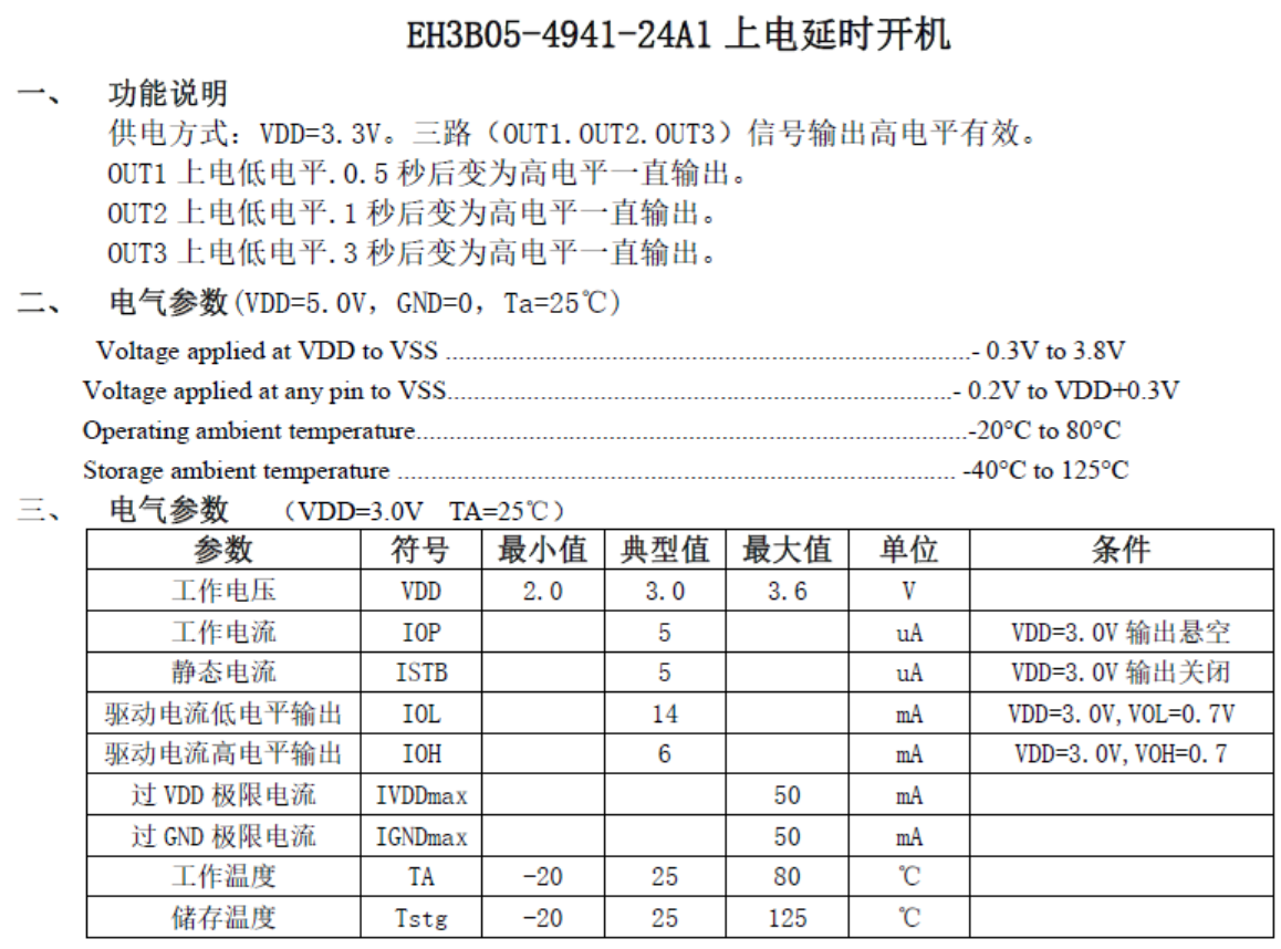 与传统的上电延时开关芯片相比,EH3B05-4941-24A1在体积上缩小80%,功耗降低两个数量级。相较于软件延时方案,其抗干扰能力提升10倍以上,且不占用MCU资源。同类竞品如MAX6816在延时精度上相当,但工作电压范围仅2.7V-5.5V,无法适应2V低压场景。