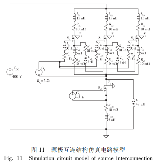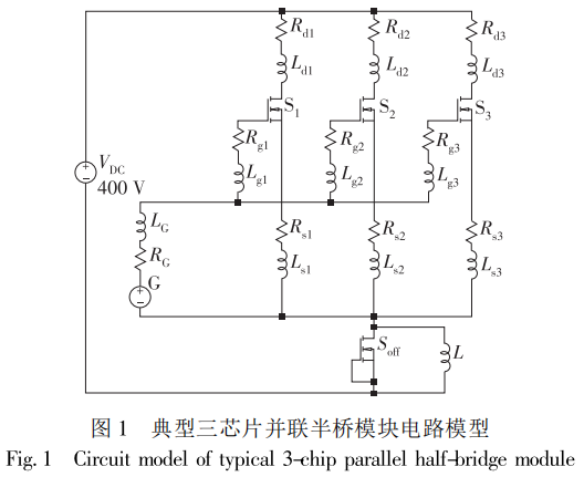 ; LG为驱动端到功率模块驱动端子的杂散电感;s为sic MOSFET ;VDC 为母线电压; L 为负载电感。这些杂散参数的存在影响了功率模块的性能,并且各芯片所在支路的杂散参数差异会影响模块的并联均流能力