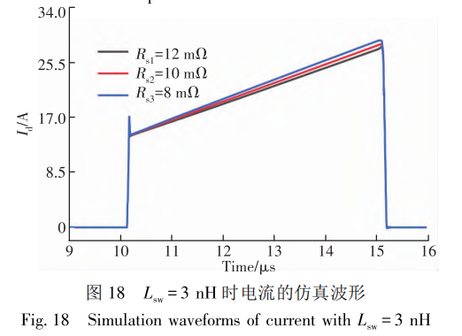 分析互连键合线杂散电感 (L.w)对源极互连方法的影响芯片源极焊盘间通常使用键合线进行连接,在仿真时可等效为键合线电阻Rsw与电感Lsw的串联,其中Ln受键合线形态影响,数值变化较大。为了研究Lsw对源极互连方法的影响,对图17所示的不均流情况,使用不同大小的L.n分别进行仿真,结果如图18和图19所示,分析可知,当Lsw 由3nH增加至10nH时,源极互连方法对不均流情况的改善能力会降低