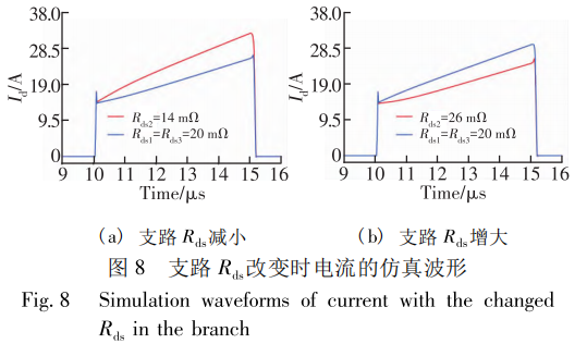 同样地,对其中一条支路上的功率回路 Rds 进行增减分析其具体影响,经双脉冲测试仿真后得到的各支路波形如图 8 所示,分析可知 : 在功率回路Rds 增大时,其对应的支路稳态电流相对减小 ; 当其减小时,则呈现相反的现象,即对应支路稳态电流增大