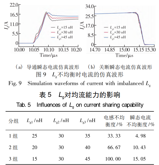 改变各支路 lg ,对比无互连模型与源极互连模型,双脉冲测试的第二个脉冲仿真波形如图 15所示。分析可知该方法无法有效改善由 lg 不均衡导致的电流不均衡