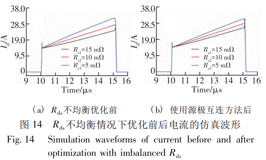 改变各支路功率回路 Rds ,对比无互连模型与源极互连模型,双脉冲测试的第二个脉冲仿真波形如图 14 所示。分析可知,该方法可以有效改善由R, 不平衡造成的电流不均衡,而无法改善由 Rd 不均衡导致的电流不均衡