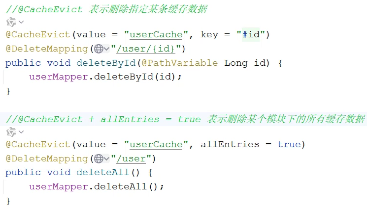 @CacheEvict:用于删除缓存,将一条或多条数据从缓存中删除