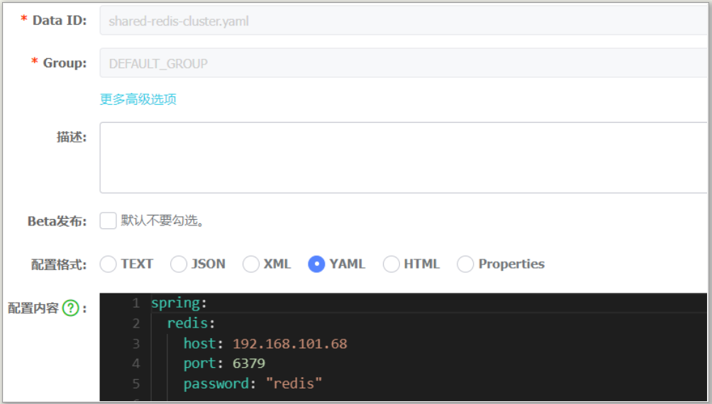 在nacos配置shared-redis-cluster.yaml,开发环境使用redis单机环境