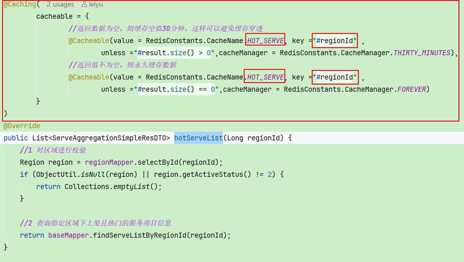 @Caching(cacheable = {//返回数据为空,则缓存空值30分钟,这样可以避免缓存穿透@Cacheable(value = RedisConstants.CacheName.SERVE_ICON, key ="#regionId" ,unless ="#result.size() > 0",cacheManager = RedisConstants.CacheManager.THIRTY_MINUTES),//返回值不为空,则永久缓存数据@Cacheable(value = RedisConstants.CacheName.SERVE_ICON, key ="#regionId" ,unless ="#result.size() == 0",cacheManager = RedisConstants.CacheManager.FOREVER)}