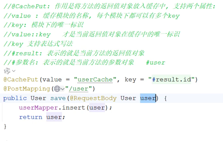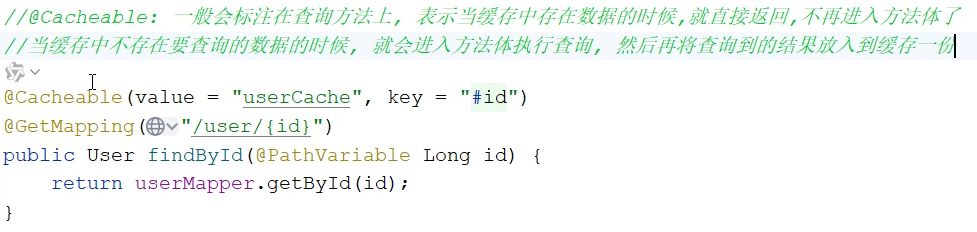 @Cacheable(value = "userCache",key = "#id",cacheManager = "cacheManager30Minutes")@GetMapping("/user/{id}")public User findById(@PathVariable Long id){return userMapper.getById(id);}