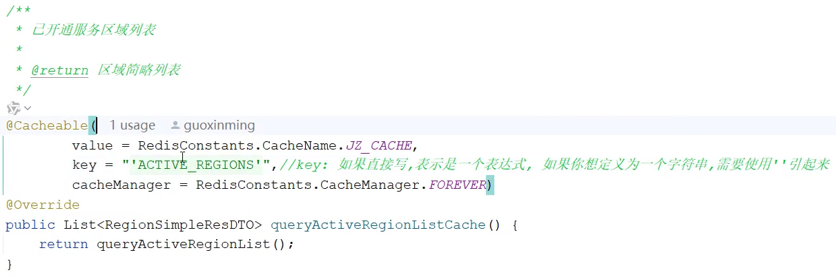 在查询开通区域列表的时候,先从缓存查询,如果有直接返回,没有再从数据库查询并存入缓存,这可以使用@Cacheable实现