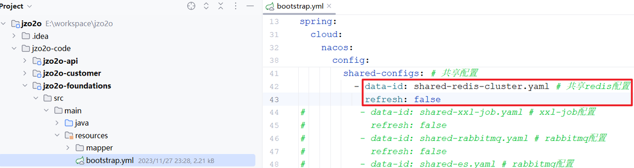 在jzo2o-foundations工程的bootstrap.yml中引入redis的配置文件