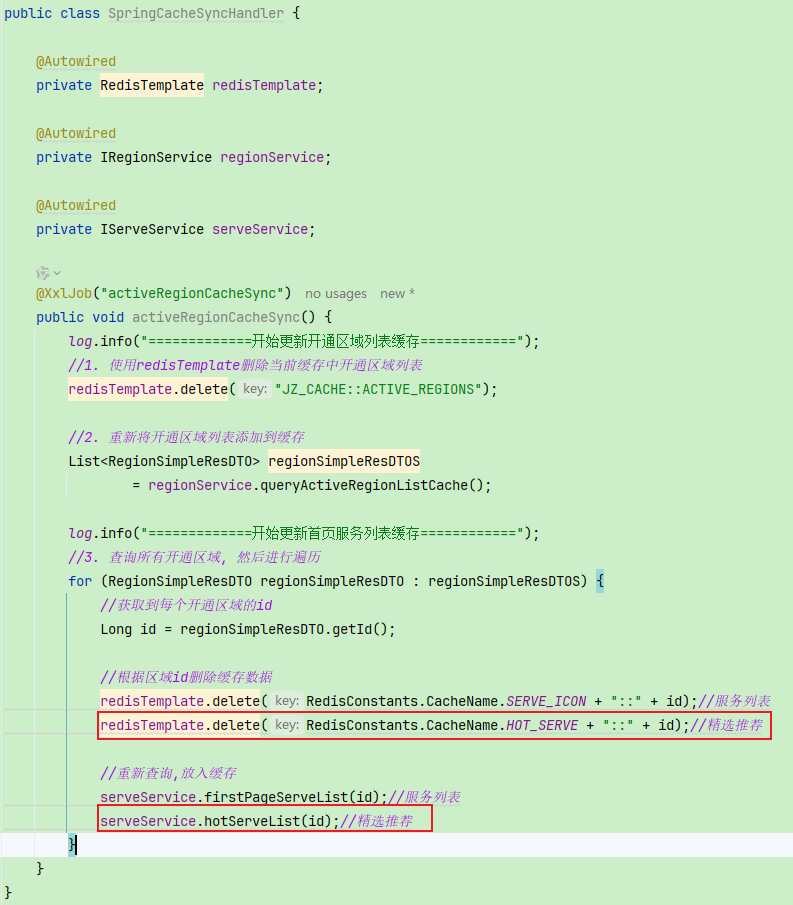 public class SpringCacheSyncHandler {@Autowiredprivate RedisTemplate redisTemplate;@Autowiredprivate IRegionService regionService;@Autowiredprivate IServeService serveService;@XxlJob("activeRegionCacheSync")public void activeRegionCacheSync() {log.info("=============开始更新开通区域列表缓存============");//1. 使用redisTemplate删除当前缓存中开通区域列表redisTemplate.delete("JZ_CACHE::ACTIVE_REGIONS");//2. 重新将开通区域列表添加到缓存List<RegionSimpleResDTO> regionSimpleResDTOS= regionService.queryActiveRegionListCache();log.info("=============开始更新首页服务列表缓存============");//3. 查询所有开通区域, 然后进行遍历for (RegionSimpleResDTO regionSimpleResDTO : regionSimpleResDTOS) {//获取到每个开通区域的idLong id = regionSimpleResDTO.getId();//根据区域id删除缓存数据redisTemplate.delete(RedisConstants.CacheName.SERVE_ICON + "::" + id);//重新查询,放入缓存serveService.firstPageServeList(id);}}