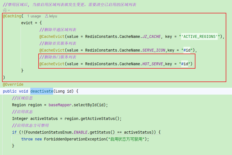 2.找到RegionServiceImpl下的deactivate(区域禁用)方法添加如下注解: