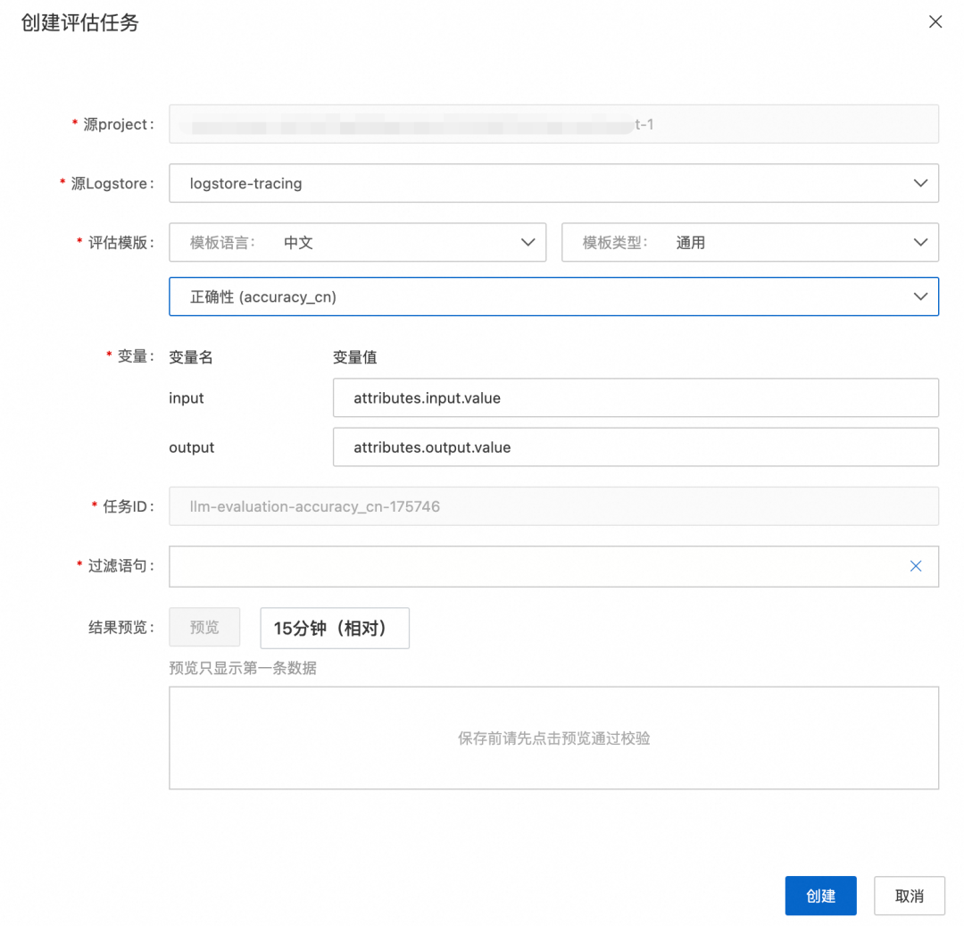 因此,创建完源 Project 和 Logstore 后,我们开始选取评估模板,在过滤语句中,选择哪些数据做评估,进行任务创建。
