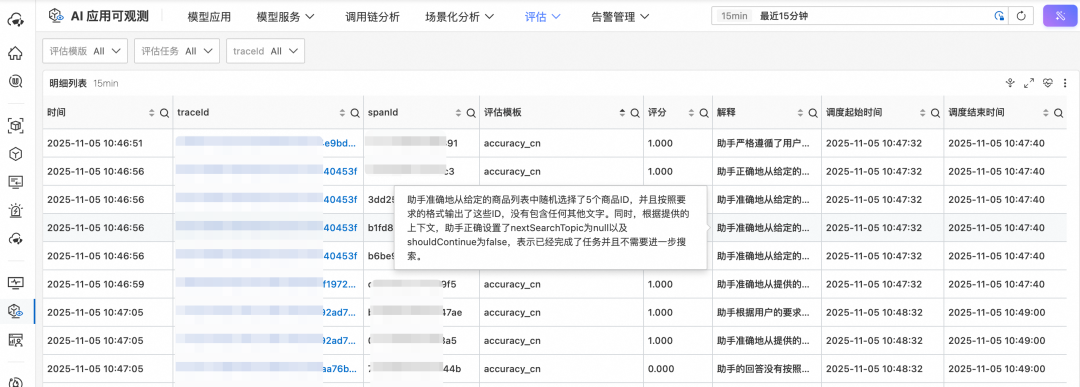 云监控2.0在 SQL/SPL 中提供评估算子,和预处理计算无缝衔接。其中,评估算子无缝集成 Qwen 等最先进的大模型,提升 LLM Judger 的评估能力。下方是通用评估模板中的准确性 accuracy,我们可以看到 Qwen 大模型对每个评估任务给出了评分。