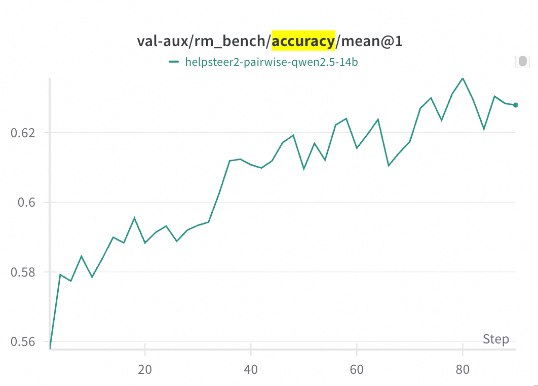 RM-Gallery 提供基于 RL 的推理奖励模型训练框架,兼容主流框架(如 Verl),并提供集成 RM-Gallery 的示例。在 RM Bench 上,经过80步训练,准确率由基线模型(Qwen2.5-14B)的约55.8%提升至约62.5%。