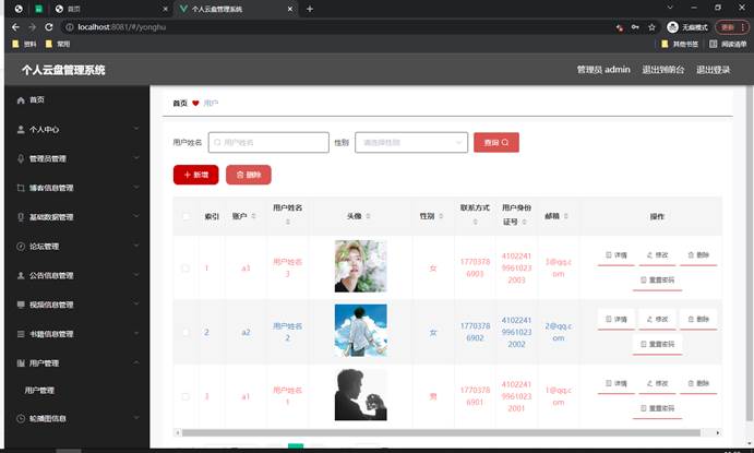 如图5.1显示的就是用户信息管理页面,此页面提供给管理员的功能有:用户信息的查询管理,可以删除用户信息、修改用户信息、新增用户信息,