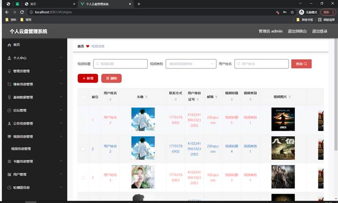 如图5.3显示的就是视频信息管理页面,此页面提供给管理员的功能有:根据视频信息进行条件查询,还可以对视频信息进行新增、修改、查询操作等等。