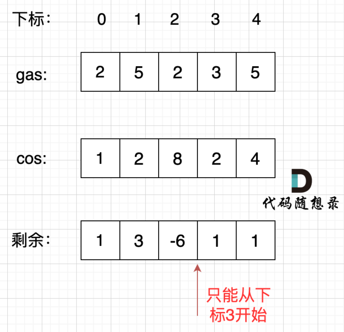 2.每个加油站的剩油量rest[i] = gas[i] - cost[i]。
