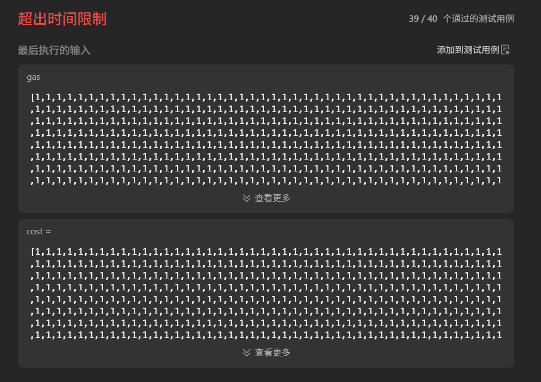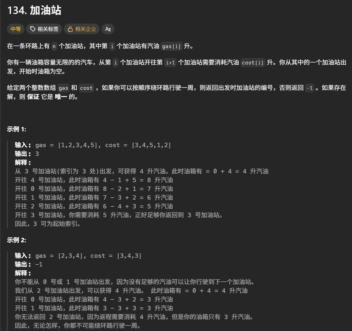 class Solution {public int canCompleteCircuit(int[] gas, int[] cost) {int tank = 0; //当前油量int totalGas = 0; //总加油量int totalCost = 0; //总油耗int start = 0; //起点for(int i = 0;i < gas.length;i ++){totalGas += gas[i];totalCost += cost[i];tank += gas[i] - cost[i];if(tank < 0){ // tank变为负数意味着在i点没油,从0到i之间无法顺利环路一周tank = 0; //重置tankstart = i + 1; //起点变为i点往后一位}}if(totalCost > totalGas) return -1;return start;}