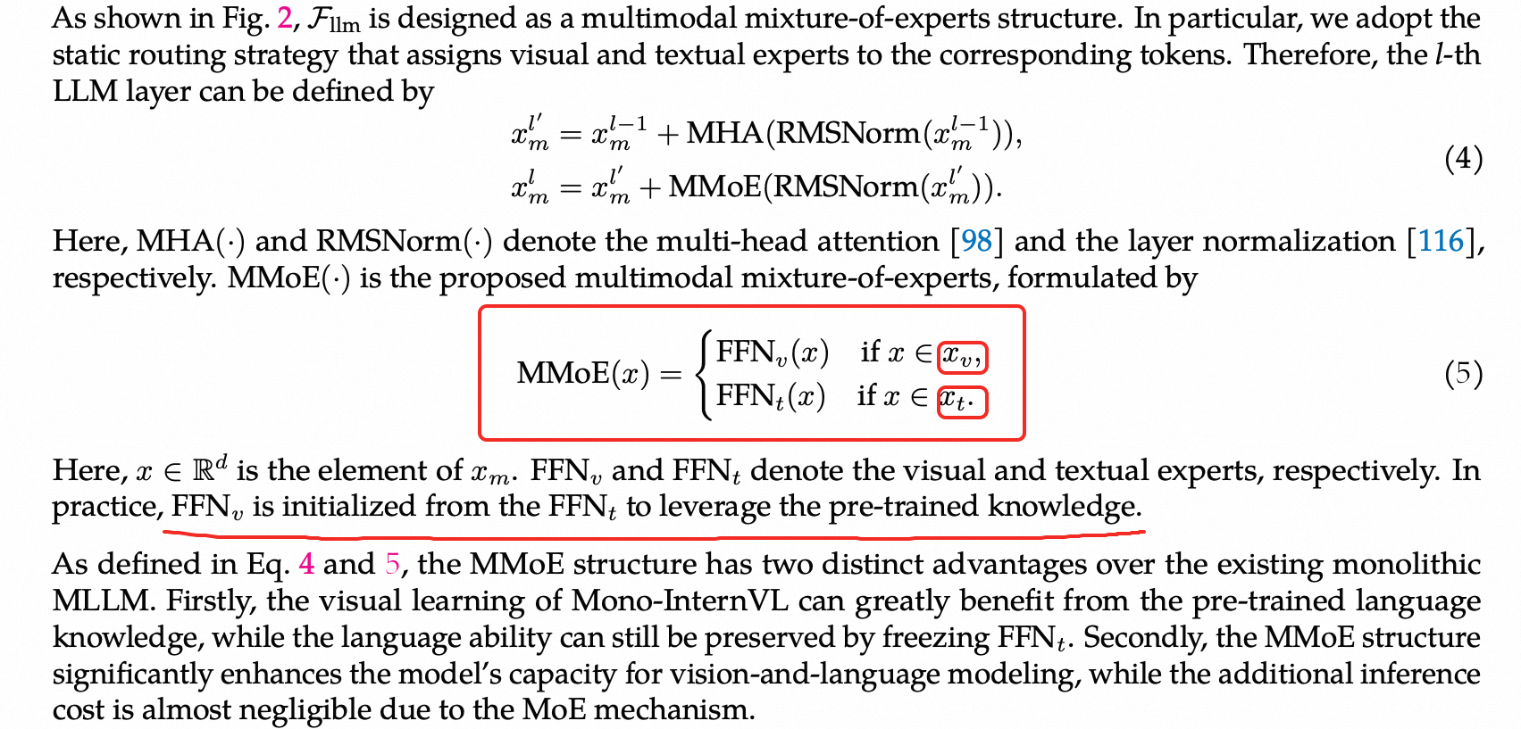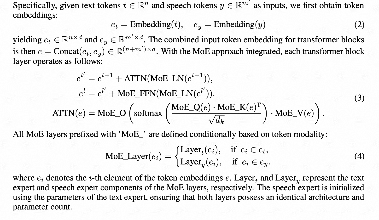 参考多模态大模型的方法,整合MOE 技术到TTS, FFN 使用两个模块,一个编码文本,一个编码音频,并且使用的是预训练的文本大模型, 这个大模型会被冻结参数。