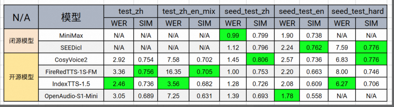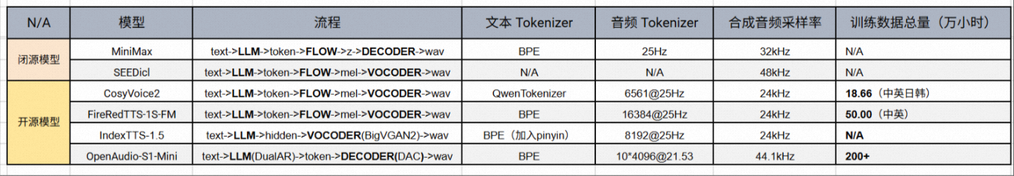 - 在训练数据规模方面,目前 OpenAudio-S1-Mini 遥遥领先,达到 200+ 万小时,显著超过其他开源模型。