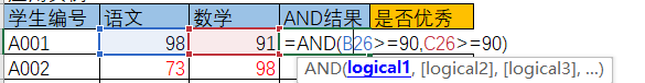 e.g. 若学生两门成绩都大于等于90分,则返回TURE,否则返回FALSE: