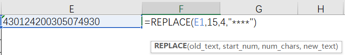 ②replace函数,第一个参数是选中原来的文本,从第15位开始后4位替换成****: