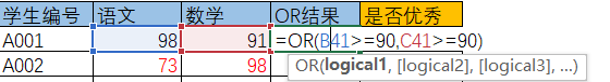 e.g. 只要有一门成绩大于等于90分,则返回TRUE,否则返回FALSE: