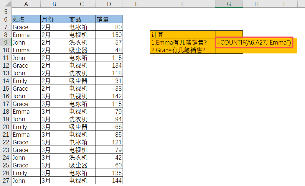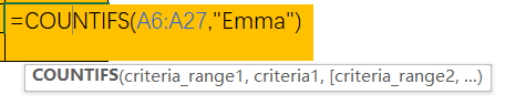 ①第一个参数选中区域,第二个参数选中条件,最终结果计算出在选中区域中Emma出现了几次;