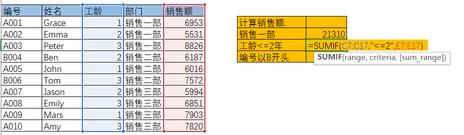 e.g. 工龄小于等于两年的销售人员的销售额: