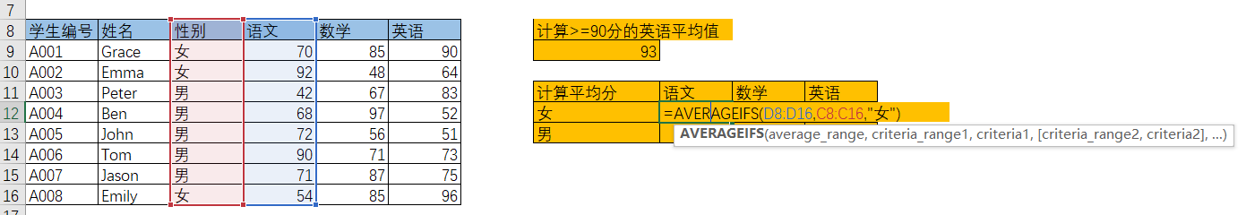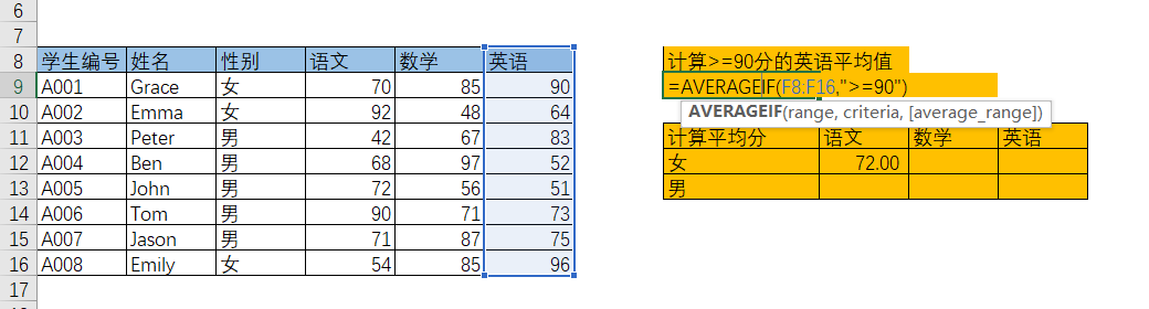 e.g. 计算》=90分的英语的平均值: