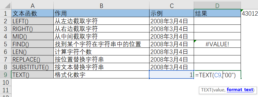 ③text函数,第一个参数选中对应的文本,第二个参数设置文本格式,比如这里的“00”表示保留两位数字,1就会变成01;