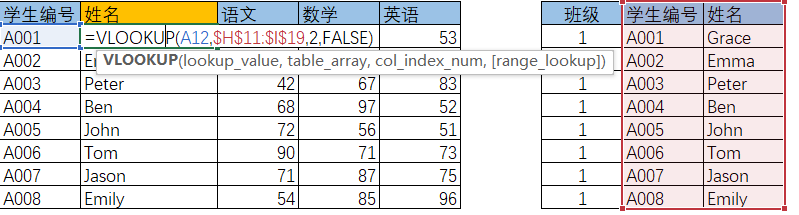 ①lookup_value,第一个参数是指你要查找的参数,也就是我们左边的A001,我要根据左边的A001去对应的表中查到学生的姓名;