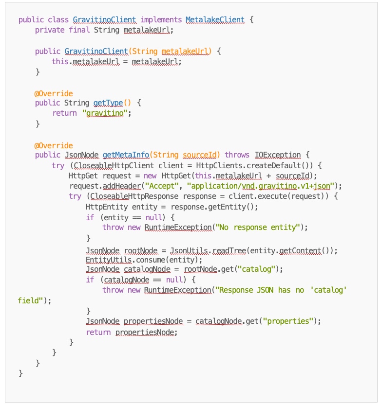 GravitinoClient类,实现MetalakeClient接口。 - 使用HTTP客户端发送请求到Gravitino API,并解析响应。