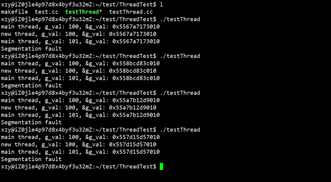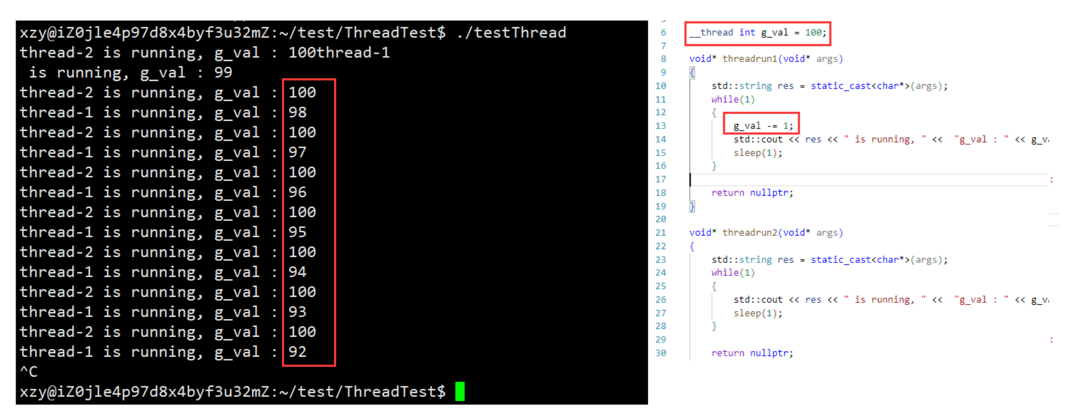 __thread, 这表示该全局变量在所有线程中都私有一份,现在我让其中一个线程停止修改g_val的操作,再次打印观察结果: