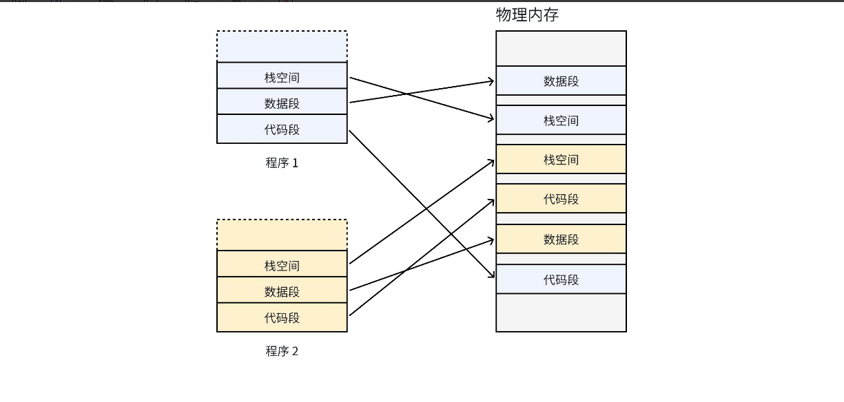 因为每⼀个程序的代码、数据⻓度都是不⼀样的,按照这样的映射⽅式,物理内存将会被分割成各种 离散的、⼤⼩不同的块。经过⼀段运⾏时间之后,有些程序会退出,那么它们占据的物理内存空间可 以被回收,导致这些物理内存都是以很多碎⽚的形式存在。怎么办呢?我们希望操作系统提供给⽤⼾的空间必须是连续的,但是物理内存最好不要连续。此时虚拟内存和分⻚便出现了,如下图所⽰: