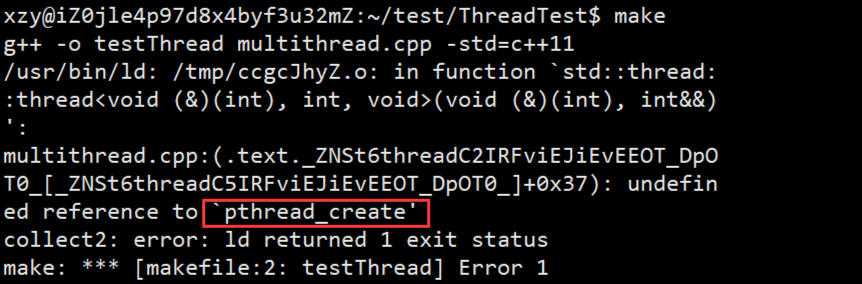 我们编译时发现,不能编译通过,原因竟然是查询不到 pthread_create所链接的库??这里也就能说明 C++11的线程库是封装了Linux的原生线程库的!