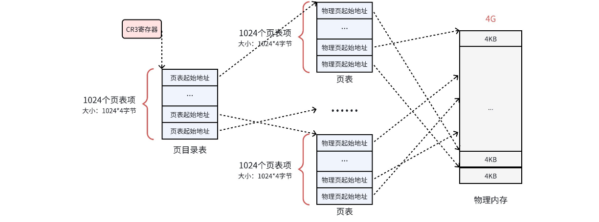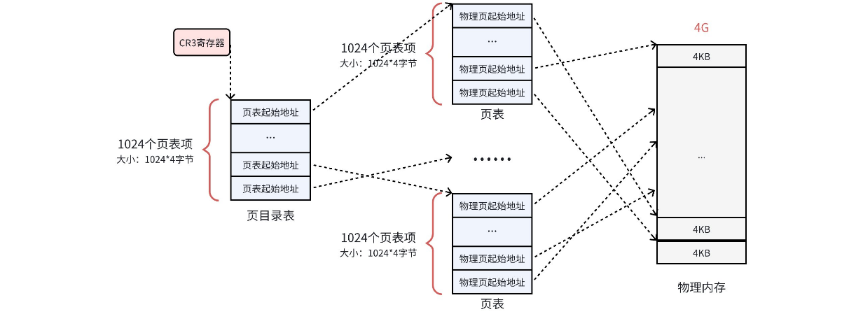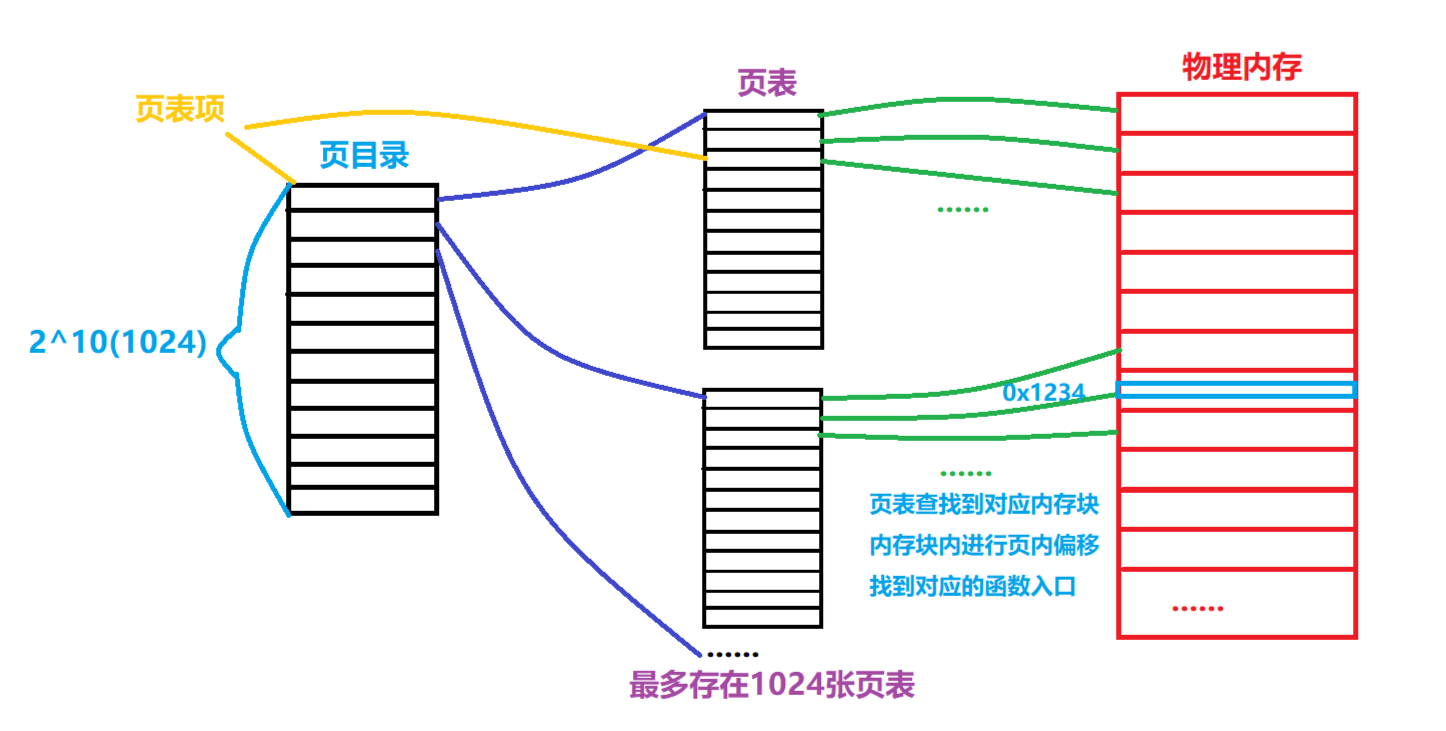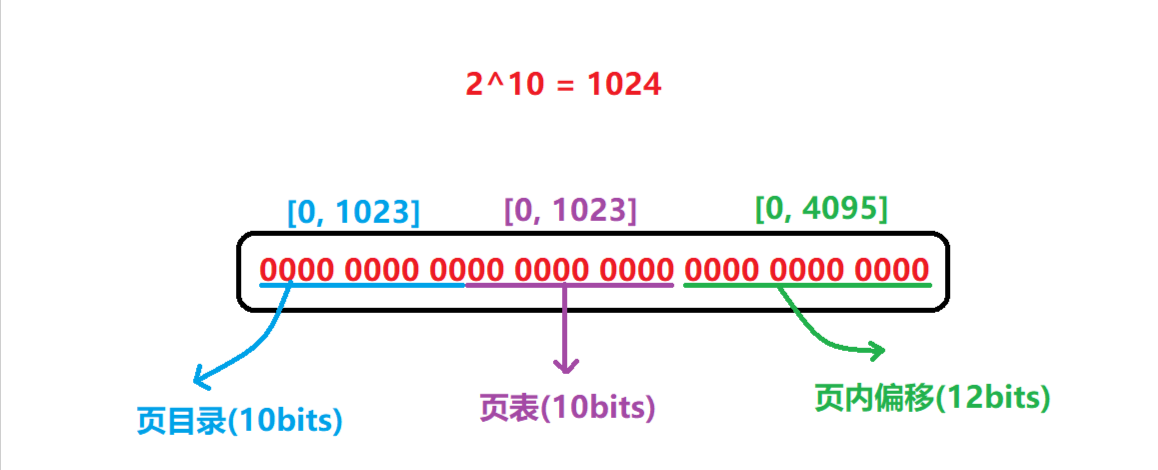 虚拟地址的前十位为页目录,页目录的每一个页表项包含每张页表的地址,页目录最大有1024个页表项。前十位比特位查找到对应的页表,页表的页表项内保存的是内存的每一个内存块地址,通过中间10位比特位可以查找到对应的内存块,最大有1024张页表。