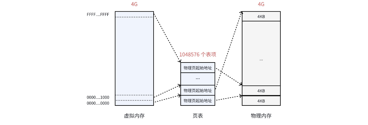 ⻚表中的每⼀个表项,指向⼀个物理⻚的开始地址。在 32 位系统中,虚拟内存的最⼤空间是 4GB , 这是每⼀个⽤⼾程序都拥有的虚拟内存空间。既然需要让 4GB 的虚拟内存全部可⽤,那么⻚表中就需 要能够表⽰这所有的 4GB 空间,那么就⼀共需要 4GB/4KB = 1048576 个表项。如下图所⽰: