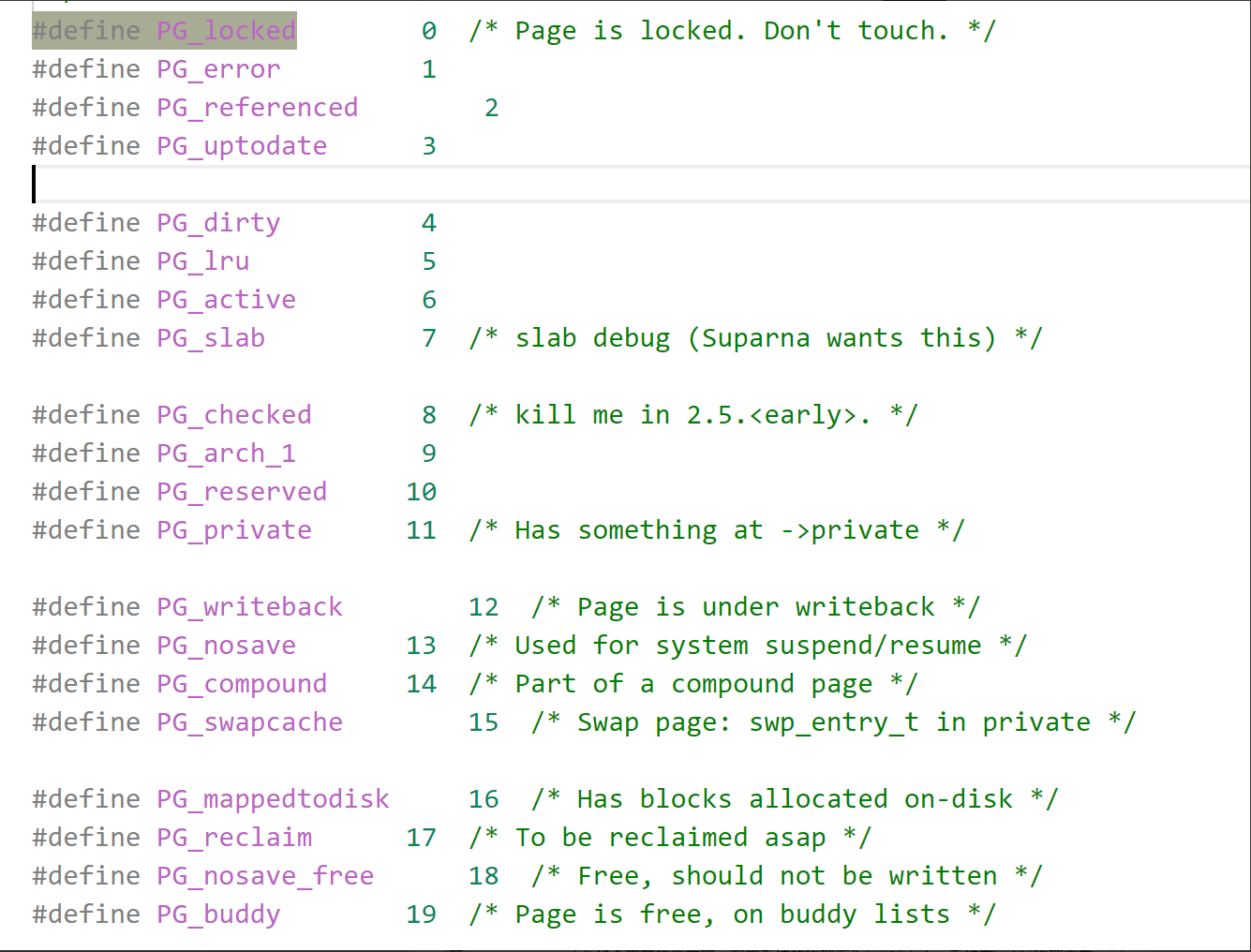 其中⽐较重要的⼏个参数1️⃣ flags : ⽤来存放⻚的状态。这些状态包括⻚是不是脏的,是不是被锁定在内存中等。flag的 每⼀位单独表⽰⼀种状态,所以它⾄少可以同时表⽰出32种不同的状态。这些标志定义在 <linux/page-flags.h>中。其中⼀些⽐特位⾮常重要,如PG_locked⽤于指定⻚是否锁定/ PG_uptodate⽤于表⽰⻚的数据已经从块设备读取并且没有出现错误。