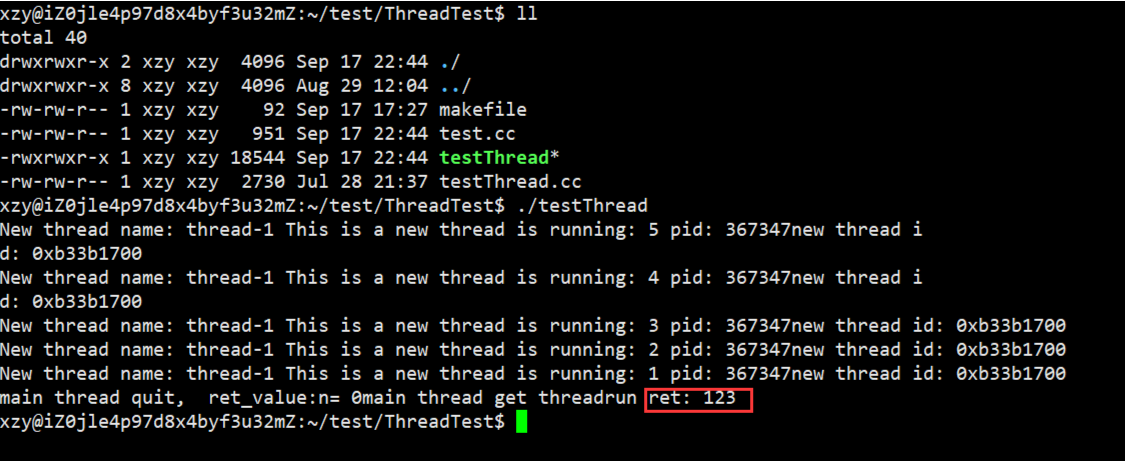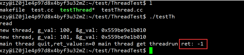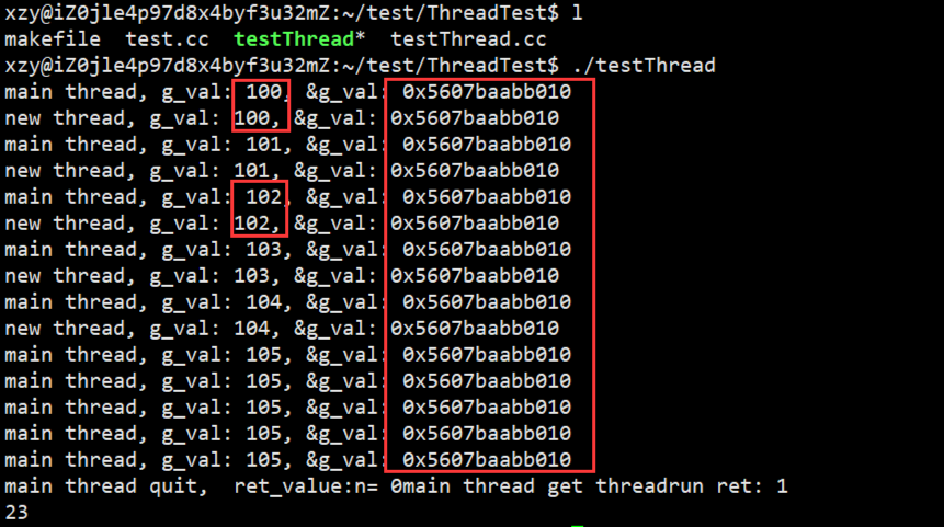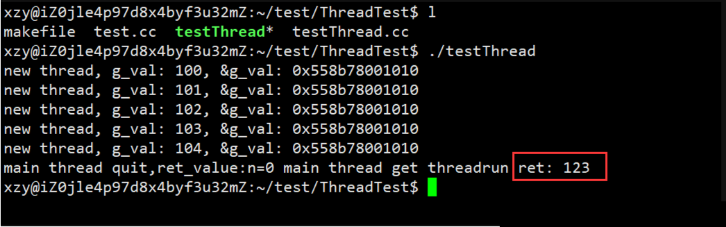 #include <iostream> #include <pthread.h> #include <cstdlib> #include <unistd.h> #include <string>int g_val = 100;std::string ToHex(pthread_t tid) {char id[64];snprintf(id, sizeof(id), "0x%x", tid);return id; }void* newthreadrun(void* args) { std::string threadname = (char*)args;int cnt = 5;while(cnt){printf("new thread, g_val: %d, &g_val: %p\n", g_val, &g_val);g_val++;sleep(1);cnt--;}pthread_exit((void*)123); }int main() {// main thread do northing, wait 5 second recyle new threadpthread_t tid;pthread_create(&tid, nullptr, newthreadrun, (void*)"thread-1");void* ret = nullptr;int n = pthread_join(tid, &ret);std::cout << "main thread quit,ret_value:n=" << n << " main thread get threadrun ret: " << (long long)ret << std::endl;return 0; }