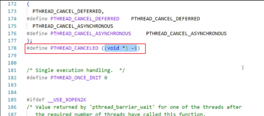 从上述代码可以观察到,pthread_cancel()有点类似于Linux当中的kill命令。当一个线程被取消了,那么其退出结果就是-1,在Linux内核中定义为 PTHREAD_CANCELED 的宏: