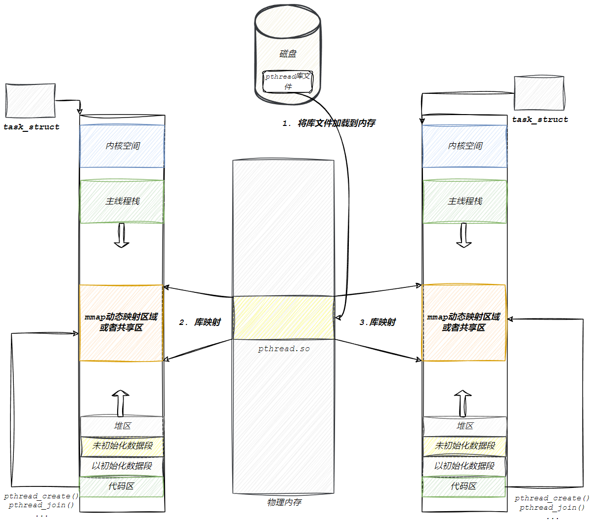 实际上这个动态库对底层做了封装,所以我们使用的线程库也被称为 用户级线程。而这个线程库属于文件,所以这个库一定是磁盘文件。而这个库文件又是动态库文件,所以它一定会映射到进程的共享空间当中。
